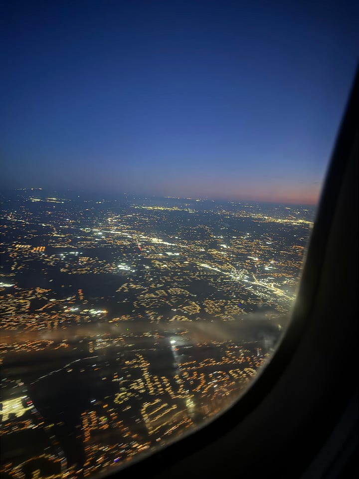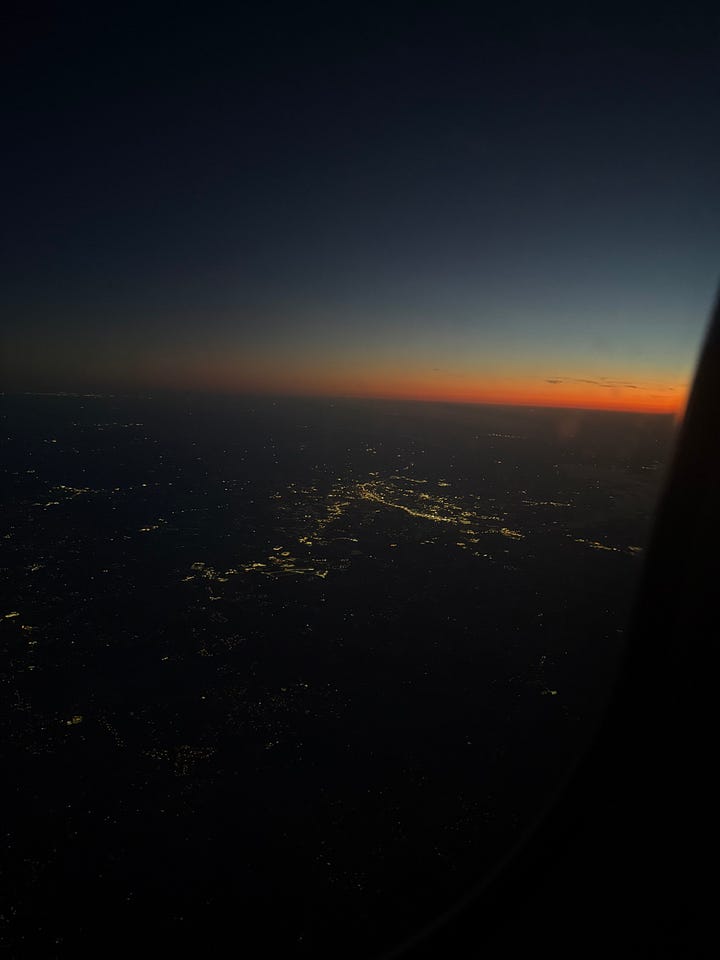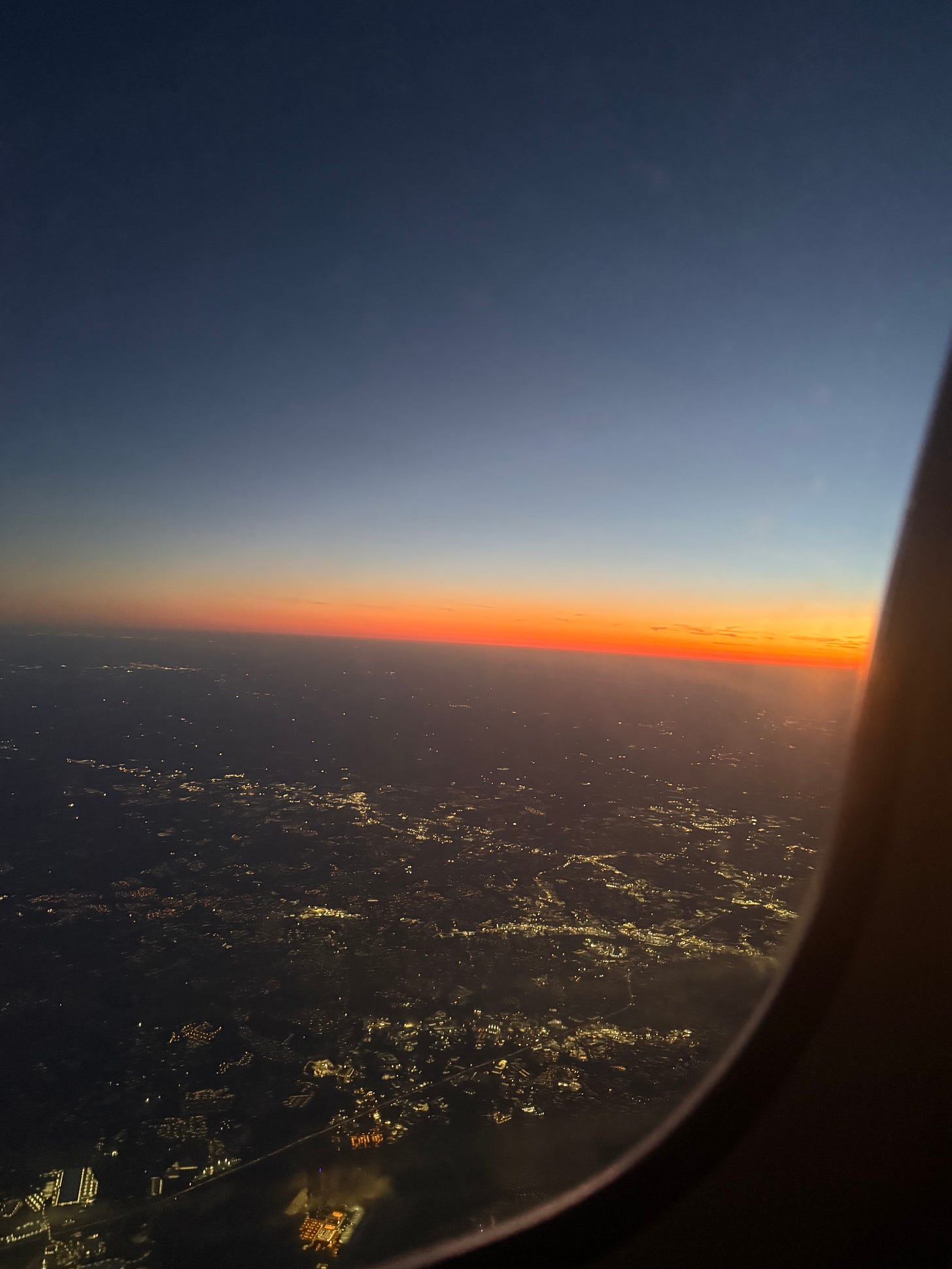 A grim orange celestial sets over Atlanta like an entombing eye watering a pulpy orange light over lit wick candles of houses and birthmarks aglow in large masses. The orange deepens, hiding its color from the pubescent tree tops and places uninhabited. Flashes— life in my mind— within the cabin, feeling my body tensing, pretending I’m within A human’s inherent nature to suspend in air, to rise, to fall, to dance with inaction. How high I am in an uncomfortable comfort, fearing gravity may long for our touch, may break this dance— a jealous lover— may press my lips to the ground through 30,000 feet of pressure of velocity of care. A dreadful descent, pictured through windows I stare: would life be different, had I stumbled mid-song and my foot had ensnared. Would life be unfair? For one dancer, not all would resent. They’d call on another partner, for in the footprints of history-- in footprints I too stepped-- for not all it would be harder. Now darkness blinks back at me, the light of its eyes from every mortal creature on the ground dancing, present. Though my years but a flicker, to shine at all, to tap my feet to the rhythm, the art to have lived.