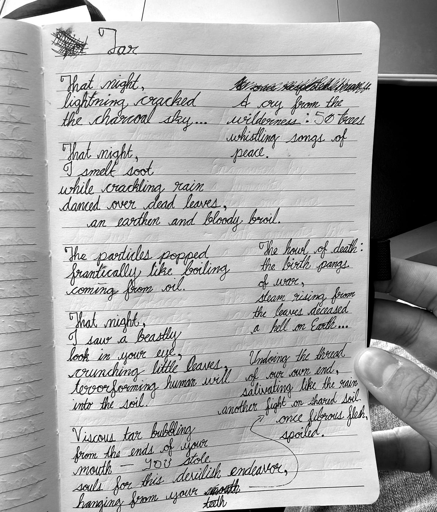 spoiled.Tar, like many of my poems, came from the spur of the moment. Walking around the city of Atlanta at night feeling the light shower of rain over me, I listened to the song “Black Sabbath” on the band’s self-titled album Black Sabbath, where I felt consumed by the music, almost if I were in another world. I rushed quickly back to my apartment because I wanted to capture this feeling, this world. I put the song on repeat, I wrote, and I mulled over this sensation I had in my mind and in my chest. That’s where this poem came from, which evolved to take on some social commentary which is still applicable— even moreso— today. I hope you all enjoy, and thank you for reading Coffee Grounds Publication Co. <3